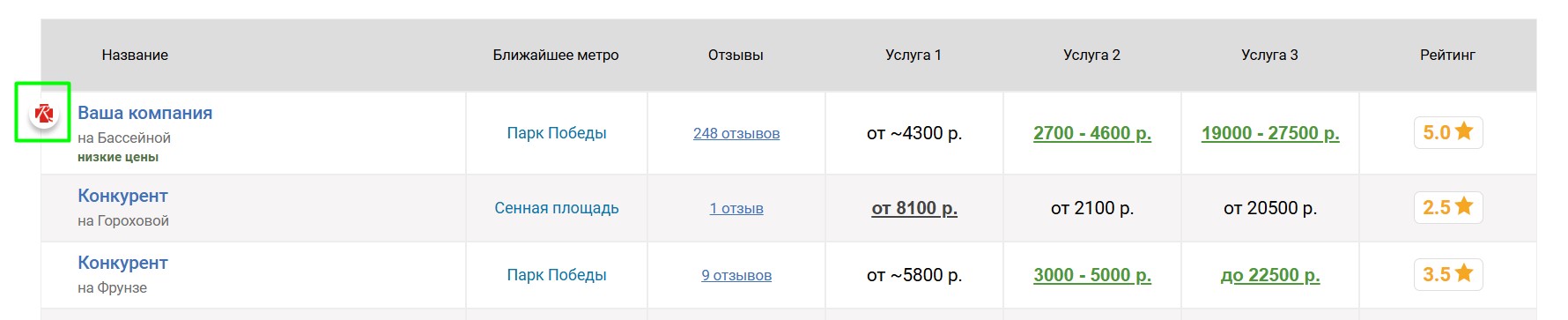 Иконка 16х16 пикселей будет отображаться слева от названия вашей автошколы в таблицах, выделяя её среди прочих. Опция увеличивает вероятность перехода на страницу компании и рекомендуется в качестве дополнения к прочим методам продвижения, в первую очередь для автошкол с узнаваемым брендом.
